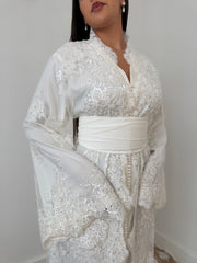 هذا القفطان العصري والأنيق، المصمم للعروس التي تبحث عن الرقي، مصنوع من التول الرقيق ومطرز يدويًا بالكامل، ليجسد الفخامة والنقاء. يتميز بذيل فخم بطول 90 سم. أما بطانة الكريب الحريري والحزام فيُبرزان جمال القوام برقة وجمال. مقاس واحد يناسب الجميع، قابل للتعديل بفضل الحزام. يُرجى الانتظار من 6 إلى 8 أسابيع للتصنيع.