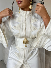 طقم مكون من تاكشيتا من الحرير الأبيض وتاهتانيا من الساتان الحريري، مزين بتطريز زواق معلم، مصنوع يدويًا بالكامل. يأتي هذا الطقم مع حزام طويل من الساتان الحريري لتحديد الخصر. مقاس واحد يناسب الجميع، قابل للتعديل بفضل الحزام. يُرجى الانتظار من 4 إلى 6 أسابيع للتصنيع.