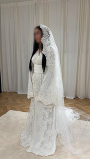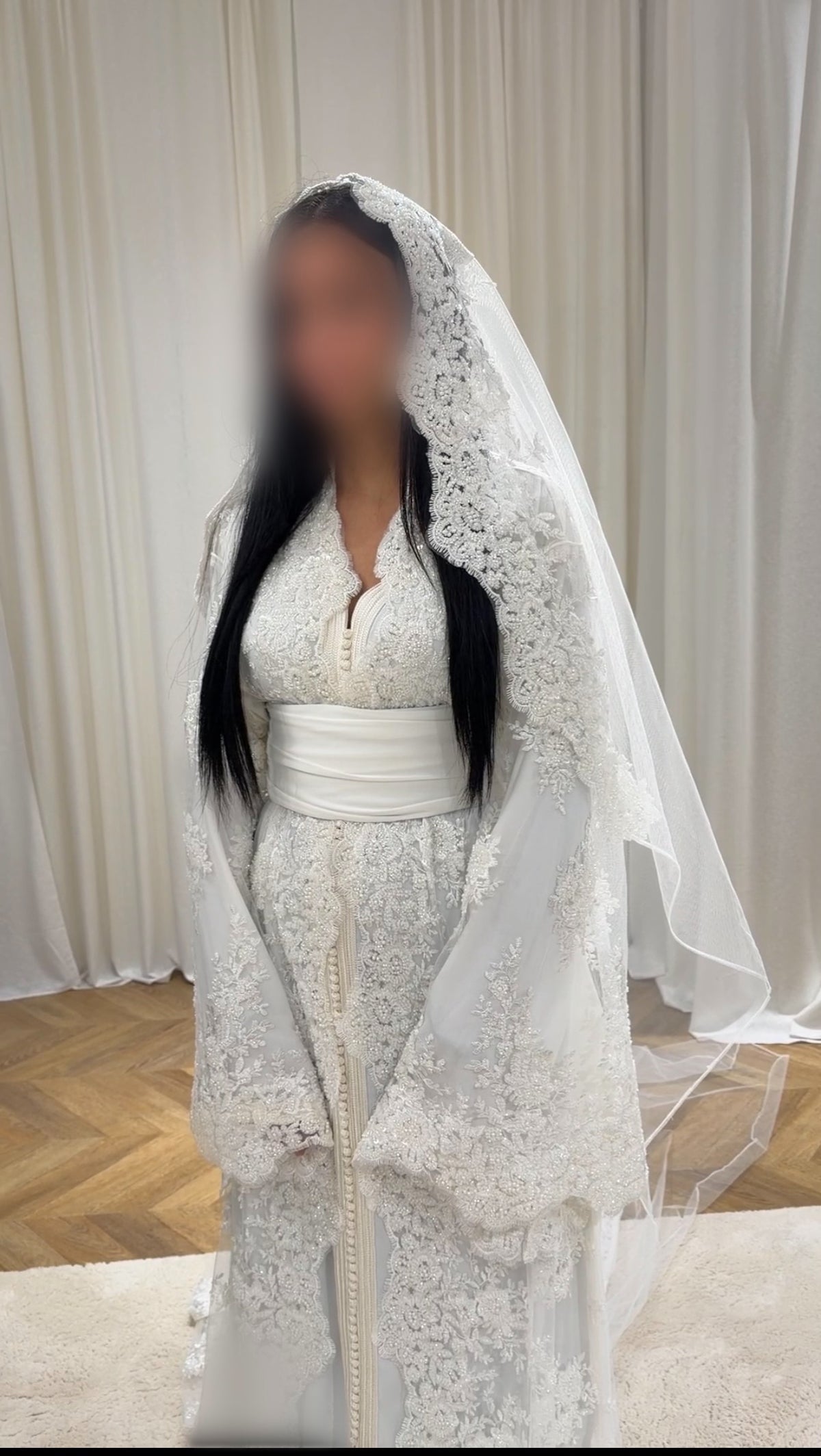 طرحة من التول مطرزة بدقة بالخرز، مصممة لإبراز جمال شال ألايا تاكشيتا. خفيفة وأنيقة، تضفي لمسة راقية على إطلالتك دون أن تثقلها. الأبعاد: 300 سم × 150 سم.