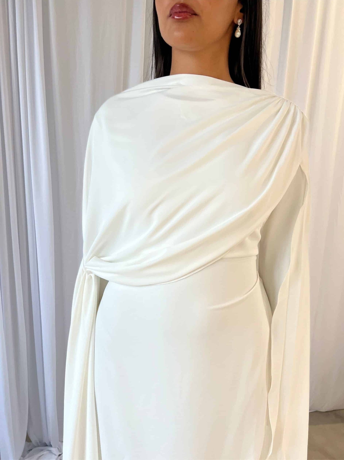 Découvrez l’élégance de cette robe de mariée modeste en crêpe de soie, fluide et épurée. Sa coupe sobre est sublimée par une cape drapée sur l’épaule, qui apporte grâce et originalité à la silhouette.Un nœud délicat au dos vient ajuster la taille et mettre en valeur la silhouette avec finesse. Un ensemble à la fois pudique et raffiné, idéal pour une mariée en quête de pureté et de modernité. Disponible en taille standard ou en confection sur mesure, avec un délai de réalisation de 8 semaines.