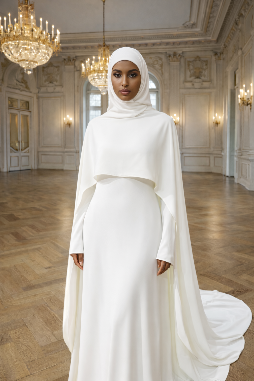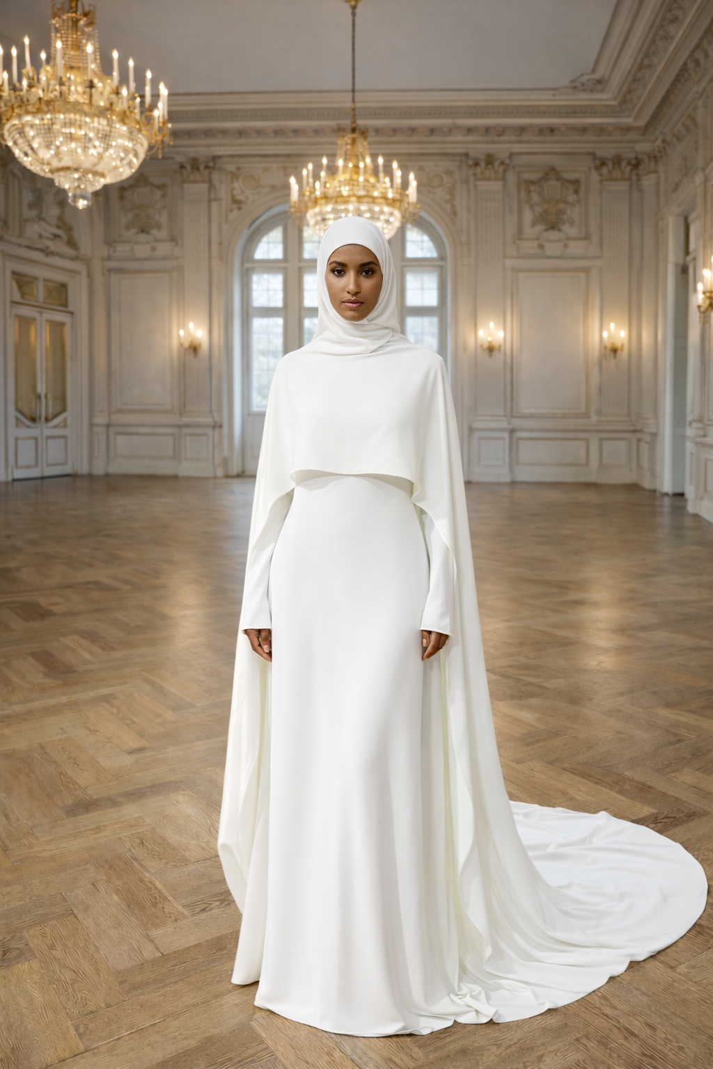 Discover the elegance of this flowing, refined silk crepe wedding dress. Its understated cut is enhanced by a long, majestic cape, which adds grace and originality to the silhouette. A delicate bow at the back adjusts the waist and delicately highlights the silhouette. A modest yet refined ensemble, ideal for a bride seeking purity and modernity.