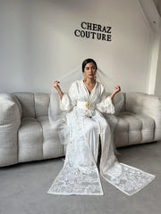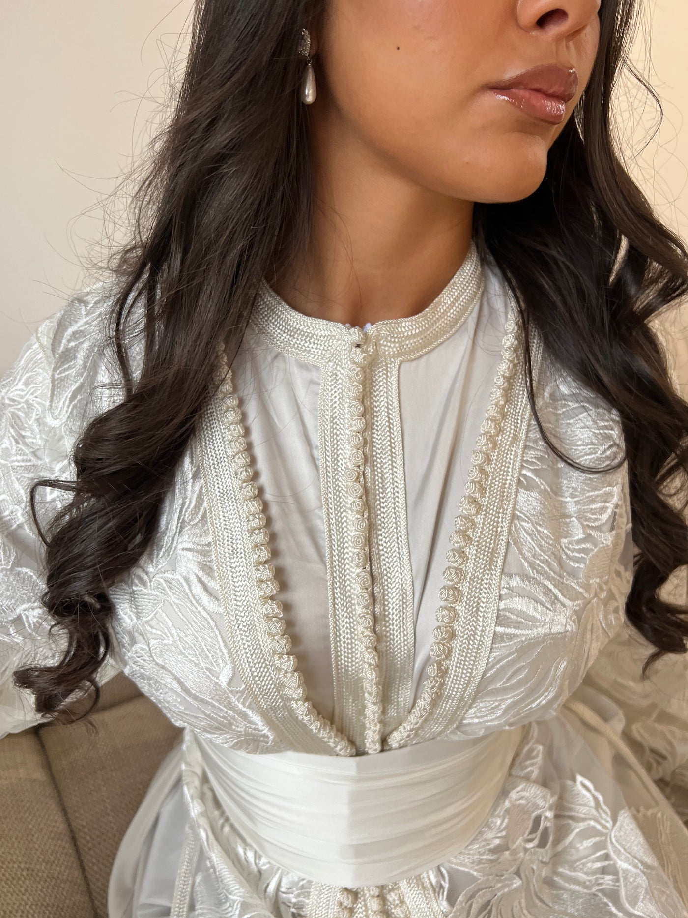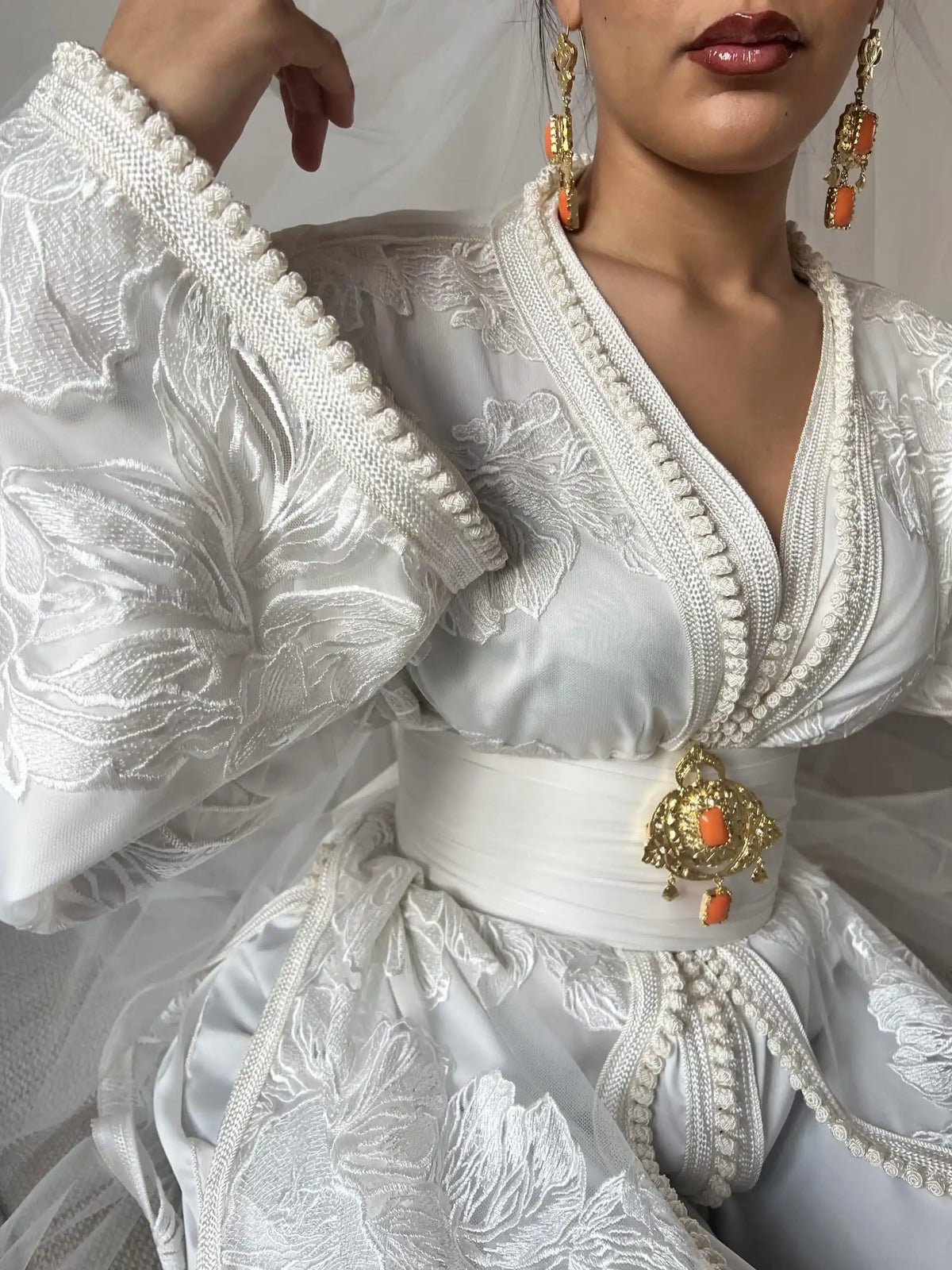 Laissez-vous charmer par la délicatesse du tulle brodé. Cette takshita, légère et raffinée, révèle toute l’essence du raffinement. Les broderies finement travaillées apportent une touche d’exception, sublimant la silhouette avec poésie et élégance. Chaque détail en fait une pièce intemporelle, pensée pour celles qui aiment se distinguer avec grâce. Elle convient du XS au XL grâce à sa ceinture ajustable, tandis que sa longueur est de 165 cm